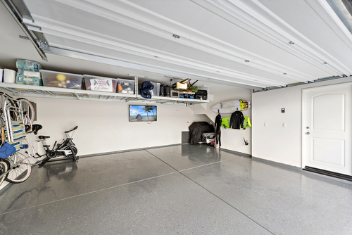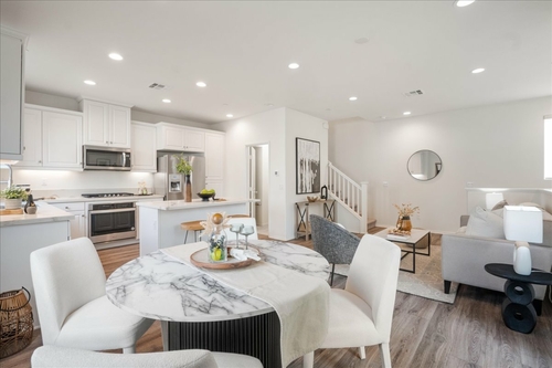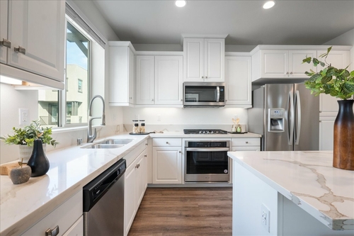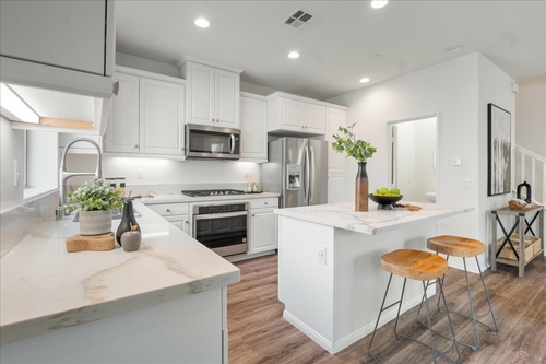 Inside, the open layout makes everyday living easy. The kitchen with white cabinetry, quartz countertops, and a custom island with seating, naturally becomes the heart of the home. Laminate plank flooring on the main level offers durability and style, while upstairs, two spacious bedrooms each feature their own private bath — ideal for guests, roommates, or growing households. Smart home features add convenience, and the epoxy-finished two-car garage with overhead storage keeps everything organized.